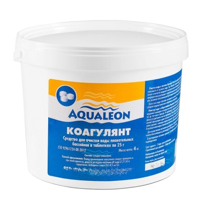 Таблетированный препарат Aqualeon Коагулянт KO4T представляет собой коагулянт длительного действия, который позволяет устранять помутнение воды плавательного бассейна. Препарат действует эффективно при любой температуре и методах ухода за водой.
